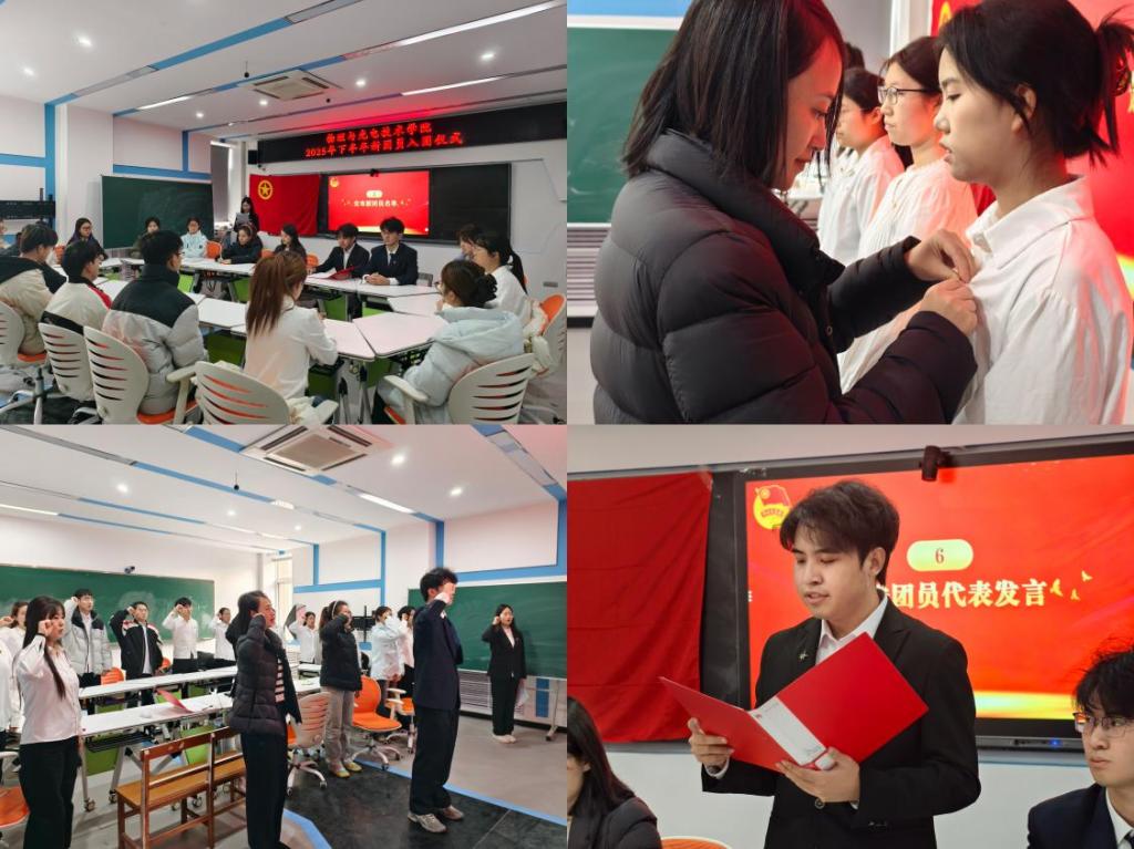 仪式在全体人员齐声高唱《中华人民共和国国歌》的庄严旋律中拉开帷幕。随后,学院团委组织部负责人杨佳同学庄重宣读2025年下半年新发展团员名单,殷欣禾为13名新发展团员逐一佩戴团徽。在优秀团员代表张玺韬的领誓下,全体新团员面向鲜艳的团旗庄严宣誓。新团员代表魏家乐同学分享入团的经历与感悟,表态将以入团为新起点用实际行动践行团员的责任与担当,不辜负团组织的信任与期望。老团员代表郭凯鑫同学则结合自身成长经历,向新团员们分享了在团组织中的收获与感悟,鼓励新团员要珍惜团员身份,始终坚守初心、奋勇争先,在青春的赛道上跑出属于自己的精彩成绩。