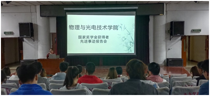 为宣传榜样力量,营造良好学风,进一步推进我院学风建设,4月12日晚,我院在石鼓校区二号报告厅举办“树典型学榜样”国家奖学金获得者先进事迹报告会。此次报告会邀请了电子电气工程学院国家奖学金获得者武轩、外国语学院国家奖学金获得者高国星、太阳成tyc234cc国家奖学金获得者戴万庆、柳嘉静为大家分享自己的事迹,2019级、2020级部分同学参加了此次报告会,樊旭娜老师主持了此次报告会。