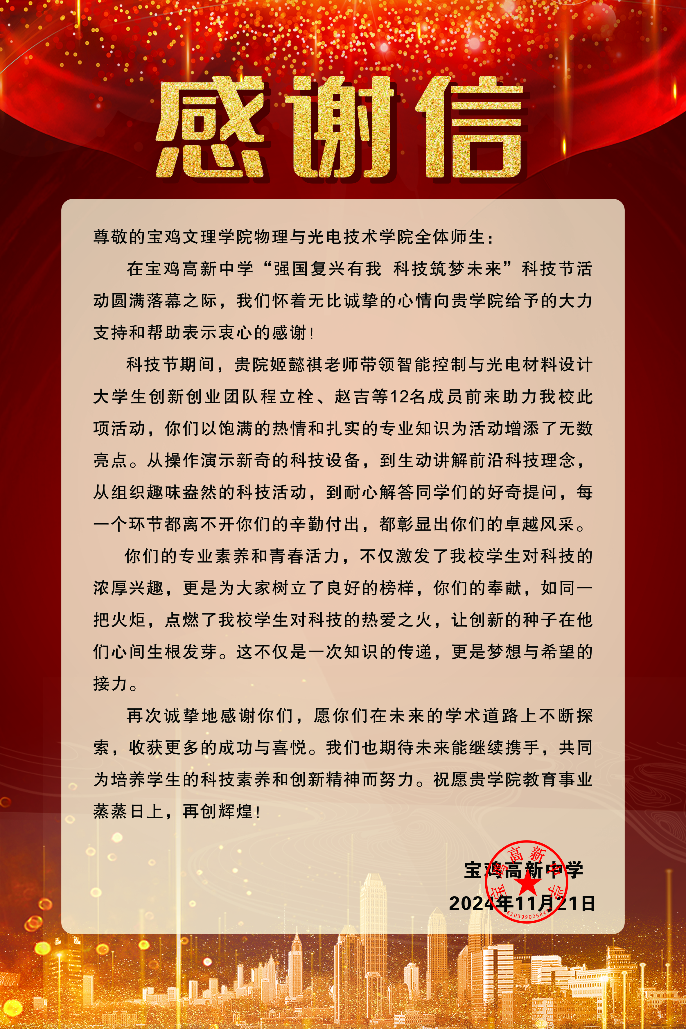 成员们在展演中积极与学生们互动,详细讲解每个作品的原理和应用,受到了师生们的热烈欢迎和高度评价。活动结束后,宝鸡市高新中学发来感谢信,信中对太阳成tyc234cc精心筹备此次科创展演以及为学校科技节带来的丰富体验和创新启发表达了诚挚的感激之情,并高度赞扬了学院在激发学生科学热情、助力科技教育发展等方面所做出的积极贡献。