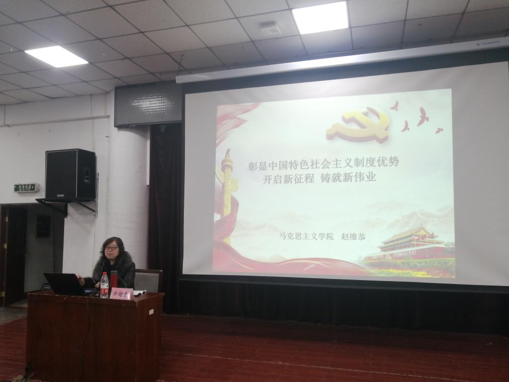 赵老师以“彰显中国特色社会主义制度优势,开启新征程铸就新伟业”为题,带领大家进行了党的十九届五中全会精神学习,主要从社会主义制度是历史和人民的选择、决胜全面建成小康社会10方面决定性成就、中国特色社会主义制度为开辟中国之治新境界提供了坚实基础和有力保障、开启中国社会主义现代化建设新征程铸就新伟业等四个方面展开,紧密结合实际,深入浅出、逐层递进论述了我国社会主义制度优势,回顾了党和国家“十三五”以来取得的成就,介绍了《中共中央关于制定国民经济和社会发展第十四个五年规划和二〇三五年远景目前的建议》的起草过程和核心亮点,并对涉及的民生议题以及双循环的新发展格局进行了充分阐释,内容丰富、思路清晰、理论性强、见解深刻,对于全面理解、准确把握十九届五中全会的精神实质具有较强的指导作用,参会学生表示将以此次宣讲为契机,继续深入领会十九届五中全会精神,将自己的理想同祖国的前途、自己的人生同民族的命运紧密联系在一起,勇于开拓,做新时代的奋斗者。