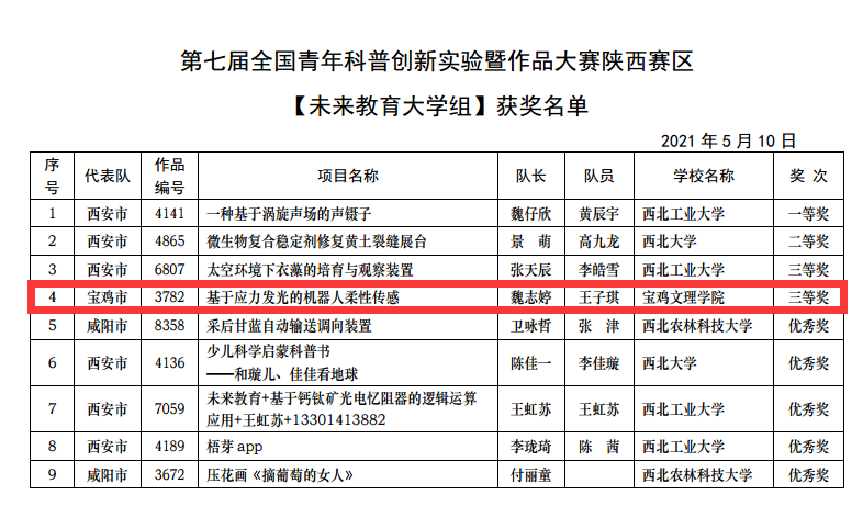 近日,由陕西省科协主办、陕西省青少年科技交流中心承办的第七届全国青年科普创新实验暨作品大赛(陕西赛区)在西安启动。本届大赛以“智能、安全、环保”为主题,包含未来教育、智能环境、生物环境和风能利用4个命题。吸引了来自西安交通大学、西北工业大学、西安电子科技大学等14所高等院校师生参赛。经过激烈比拼,我院2019级物理学专业研究生魏志婷、王子琪的参赛作品“基于应力发光的机器人柔性传感”斩获“未来教育大学组”省级三等奖。