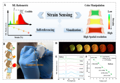 基于力致发光特性的力学传感技术由于其自驱动、可视化、非接触等特性有望在新型力学传感领域得到广泛的应用。目前关于力致发光在力学传感领域的应用研究主要集中在建立力学参数和发光强度的数学关系而实现传感特性,而发光的绝对强度容易受到环境光的影响导致光信号串扰。基于此,该团队提出了一种基于陷阱辅助和差异性响应的新策略,实现了在机械刺激下的比率计、裸眼可视化动态力致发光,为力学传感技术的源头创新提供了新的思路,得到国内外同行的一致认可。